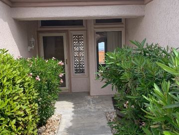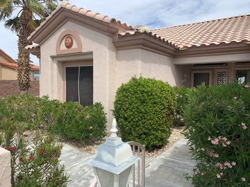 Upon pulling up there is desert landscape and two mature pineapple and Sega palm trees.